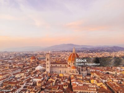 Aerial view of Florence's skyline at sunset. Santa Maria del Fiore and other famous buildings in Florence, Tuscany, Italy.